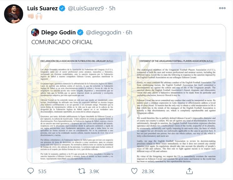 | ▲ 우루과이 축구선수협회 성명 공유한 수아레스와 고딘 [트위터 캡처] |