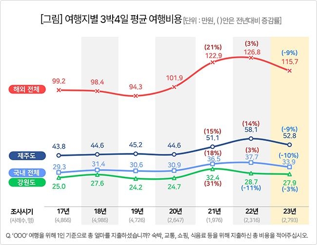 해외여행자는 여행경비로 국내여행의 3배, 제주 여행의 2배 이상을 지출한 셈이다.
