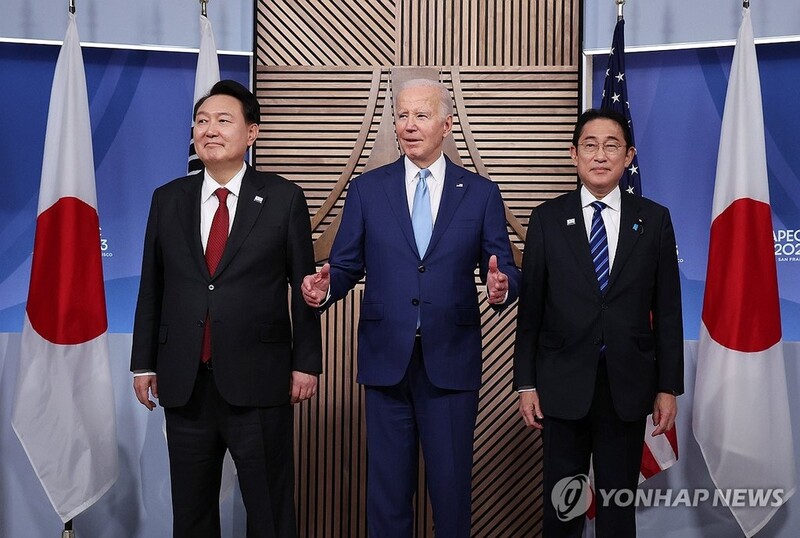 After having their photo taken, Biden reportedly thanked Yoon and Kishida for lightening his load in performing his duties as president of the United States, a likely reference to Yoon and Kishida's efforts to mend the South Korea-Japan relationship, which is key to the implementation of U.S. policy for the Indo-Pacific region.