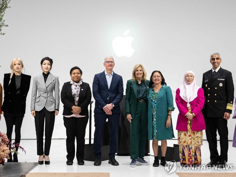 | ▲ APEC 행사에 참석한 블랙핑크 로제 (쿠퍼티노[美캘리포니아주] AFP=연합뉴스) 아시아태평양경제협력체(APEC) 정상회의에 참석한 각국 정상의 배우자들이 17일(현지시간) 캘리포니아주 쿠퍼티노 애플 본사에서 정신건강을 주제로 열린 행사에 참석하고 있다. 왼쪽부터 블랙핑크 로제, 김건희 여사, 레이첼 마라페 파푸아뉴기니 총리 부인, 팀 쿡 애플 CEO, 질 바이든 여사. 2023.11.17 |