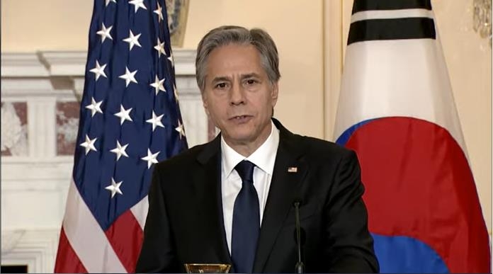| ▲ U.S. Secretary of State Antony Blinken is seen answering a question in a joint press conference with South Korean Foreign Minister Park Jin after their meeting at the state department in Washington on June 13, 2022 in this image captured from the department's website. (PHOTO NOT FOR SALE) (Yonhap) |