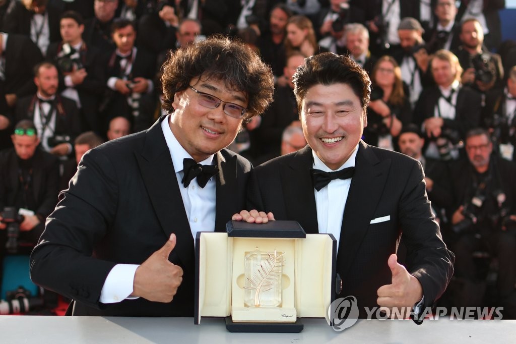 | ▲ 2019년 황금종려상 수상 당시 봉준호 감독(왼쪽)과 송강호 [EPA 연합뉴스 자료사진. 재판매 및 DB 금지] |