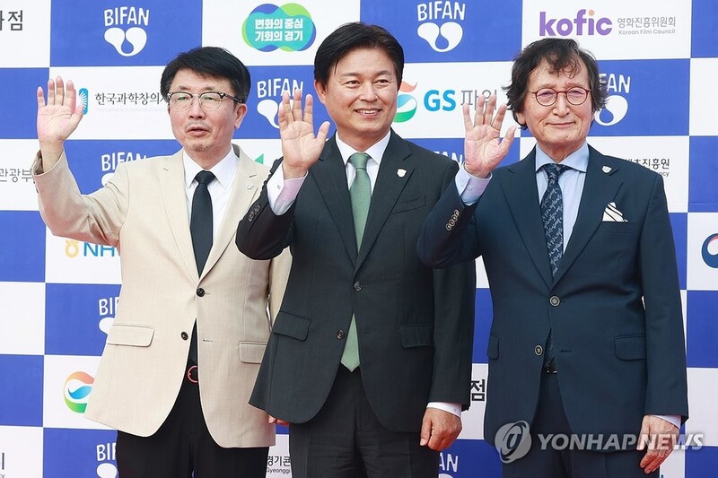 | ▲ '부천국제영화제로 놀러오세요' (부천=연합뉴스) 진연수 기자 = 4일 오후 경기도 부천시 부천아트센터에서 열린 제28회 부천국제판타스틱영화제(BIFAN) 개막식 레드카펫 행사에서 신철 집행위원장(왼쪽부터), 조용익 부천시장, 정지영 조직위원장이 포즈를 취하고 있다. 2024.7.4 jin90@yna.co.kr |