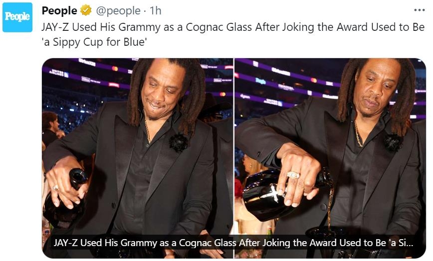 당일 제이지는 그래미 시상식에서 '닥터 드레 글로벌 임팩트' 상을 받고 무대에 올라 주최 측인 레코딩 아카데미를 작심하고 비판하는 발언을 쏟아낸 바 있어 그가 트로피를 술잔으로 사용한 의도에 관심이 쏠렸다.