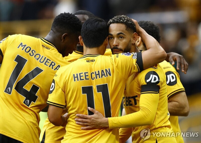 ▲ 마테우스 쿠냐의 골에 기뻐하는 황희찬(11번) 등 울버햄프턴 선수들 [로이터=연합뉴스]