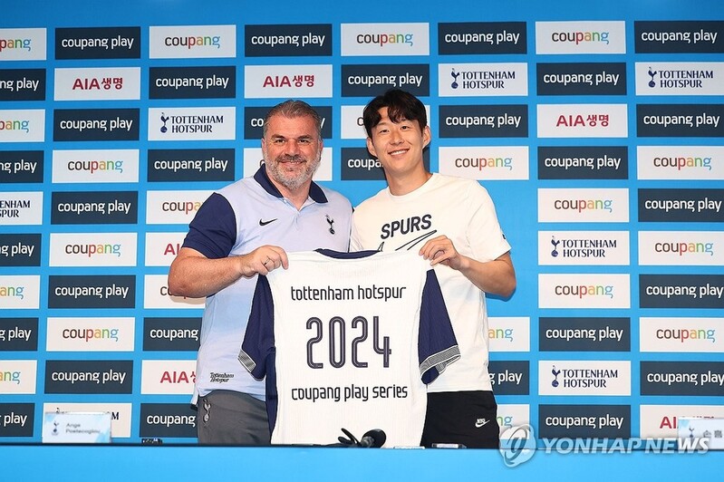 | ▲ 팀 K리그와 경기 앞둔 손흥민-포스테코글루 (서울=연합뉴스) 류영석 기자 = 2024 쿠팡플레이 시리즈 토트넘과 팀 K리그의 경기를 하루 앞둔 30일 서울월드컵경기장에서 열린 프리 매치 기자회견에서 손흥민과 포스테코글루 감독이 기념촬영을 하고 있다. 2024.7.30 ondol@yna.co.kr |