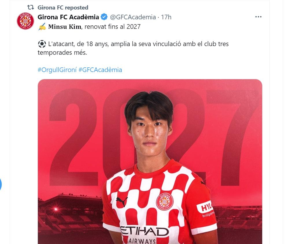 지로나 구단은 22일(한국시간) 사회관계망서비스(SNS)를 통해 김민수와 2027년까지 계약을 연장했다고 발표했다.