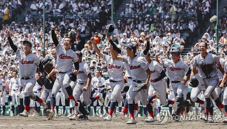 | ▲ "고시엔 우승은 우리"…응원석쪽으로 달려가는 교토국제고 선수들 (니시노미야[일본] 교도=연합뉴스) 한국계 국제학교인 교토국제고 선수들이 23일 일본 효고현 니시노미야 한신고시엔구장에서 열린 전국 고교야구선수권대회(여름 고시엔) 결승전에서 간토다이이치고를 2-1로 이기고 우승한 뒤 응원석 쪽으로 달려가고 있다. 2024.8.23 chungwon@yna.co.kr |