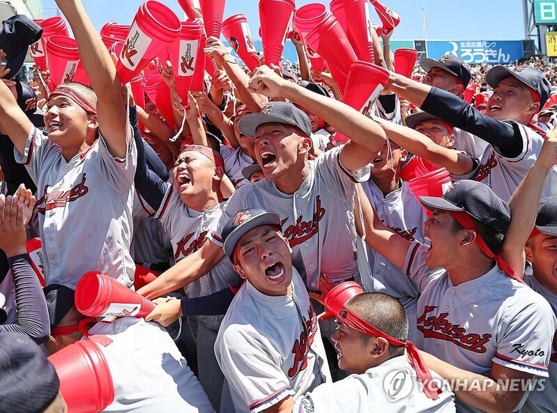 | ▲ 고시엔 첫 우승 기쁨 나누는 교토국제고 (니시노미야[일본]=연합뉴스) 류영석 기자 = 23일 일본 효고현 니시노미야 한신 고시엔구장에서 열린 일본 전국 고교야구선수권대회(고시엔) 결승전 교토국제고와 간토다이이치고 경기. 2-1 승리를 거두고 우승을 차지한 일본 내 한국계 민족학교인 교토국제고 재학생들이 관중석에서 기쁨을 나누고 있다. 2024.8.23 ondol@yna.co.kr |