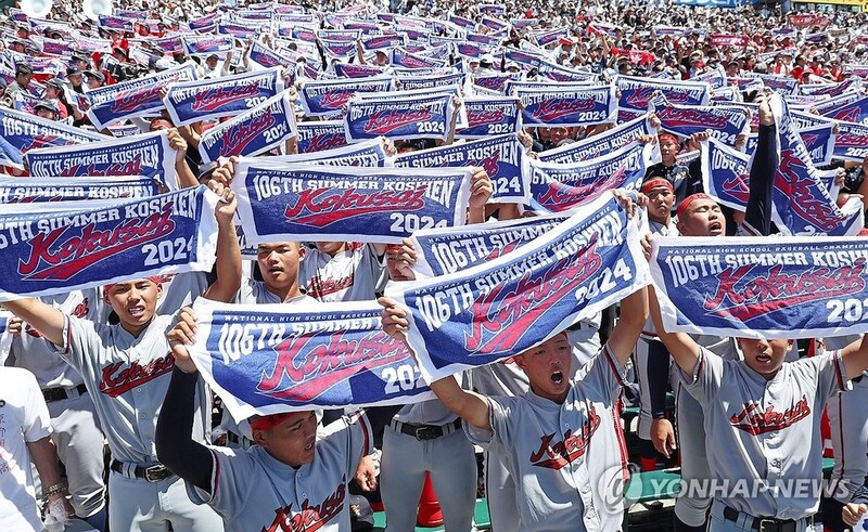 | ▲ 교가 부르는 교토국제고 야구부 학생들 (니시노미야[일본]=연합뉴스) 류영석 기자 = 23일 일본 효고현 니시노미야 한신 고시엔구장에서 열린 일본 전국 고교야구선수권대회(고시엔) 결승전 교토국제고와 간토다이이치고 경기. 2-1 승리를 거두고 우승을 차지한 일본 내 한국계 민족학교인 교토국제고 야구부 재학생들이 관중석에서 교가를 부르고 있다. 2024.8.23 ondol@yna.co.kr |
