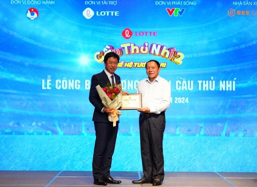 | ▲ 'Cau Thu Nhi'(까우투니) 시즌2 제작발표회 응우옌 번 훙 베트남 문화체육부장관(오른쪽)은 롯데가 베트남 유소년 축구 발전 기여에 대한 보답으로 이갑 롯데지주 커뮤니케이션실장(왼쪽)에게 감사패를 전달했다.[롯데 제공. 재판매 및 DB금지] |