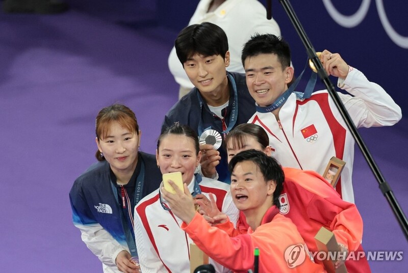 ▲ 김원호-정나은, 은메달 셀카 (파리=연합뉴스) 김인철 기자 = 2일(현지시간) 프랑스 파리 라 샤펠 아레나에서 열린 2024 파리올림픽 배드민턴 혼합복식 시상식에서 은메달을 딴 한국 김원호-정나은이 금메달의 중국, 동메달의 일본 선수들과 함께 삼성폰으로 셀카를 찍고 있다. 2024.8.3 yatoya@yna.co.kr |