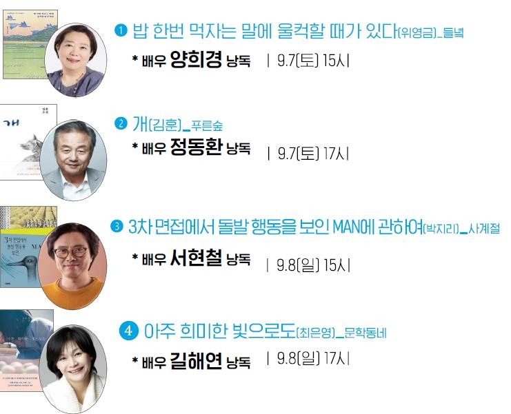 7일 오후 양희경이 위영금 작가의 에세이 '밥 한번 먹자는 말에 울컥할 때가 있다'를, 정동환이 김훈의 소설 '개'를 낭독한다. 8일에는 배우 서현철과 길해연이 각각 박지리의 소설 '3차 면접에서 돌발 행동을 보인 맨(MAN)에 관하여'와 최은영의 소설 '아주 희미한 빛으로도'를 읊을 예정이다. 책 내용을 50분 분량으로 축약해서 선보인다.