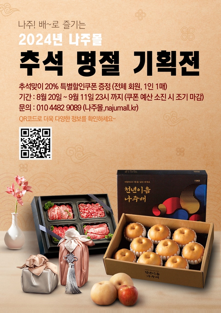 (나주=연합뉴스) 송형일 기자 = 전남 나주시는 농특산물 온라인 쇼핑몰인 '나주몰'에서 추석 명절 할인 기획전을 9월 11일까지 한다고 29일 밝혔다.