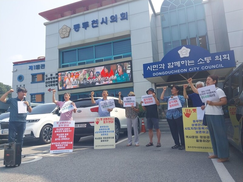 | ▲ 옛 성병관리소 철거에 반대하는 시위 (동두천=연합뉴스) 지난 13일 경기 동두천시의회 앞에서 '동두천 옛 성병관리소 철거 저지를 위한 공동대책위원회'가 성병관리소 건물의 철거비용 예산 전액 삭감을 촉구하는 기자회견을 하고 있다. 2024.8.13 [동두천 옛 성병관리소 철거 저지를 위한 공동대책위원회 제공. 재판매 및 DB금지] |