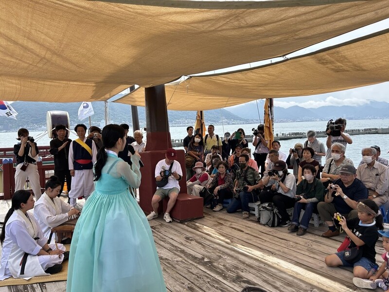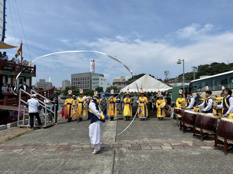 참석자들은 조선통신사선에 대한 설명을 주의 깊게 듣고 전통 공연을 즐겼다. '아리랑', '돌아와요 부산항에' 등을 연주하자 현지 주민들은 손뼉을 치며 따라 부르기도 했다.
