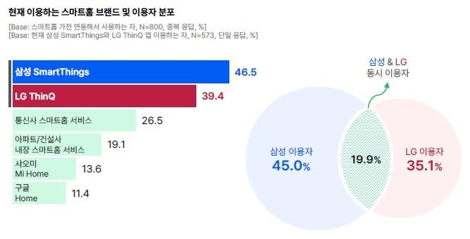 스마트홈 브랜드별로는 삼성 스마트싱스를 이용한다는 응답자가 46.5%를 차지해 가장 많았다. 이어 LG 씽큐가 39.4%로 뒤를 이었다. 삼성과 LG를 동시 이용한다는 응답자는 19.9%를 차지했다.