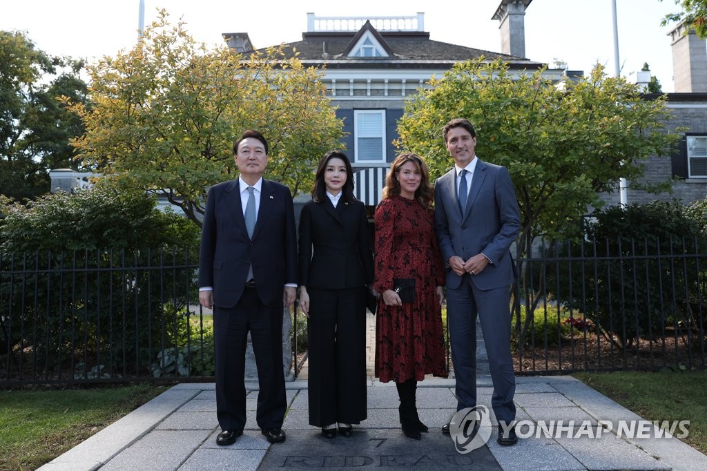 | ▲ South Korean President Yoon Suk-yeol (L), first lady Kim Keon-hee (2nd from L), Canadian Prime Minister Justin Trudeau (R) and his wife, Sophie Trudeau (2nd from R), pose for a photo ahead of a luncheon at 7 Rideau Gate, the Canadian government's official state guest house, in Ottawa on Sept. 23, 2022. (Yonhap) |