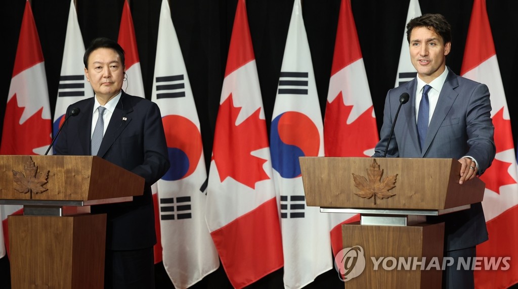 OTTAWA, Sept. 23 (Yonhap) -- South Korean President Yoon Suk-yeol and Canadian Prime Minister Justin Trudeau met in Ottawa on Friday and agreed to strengthen cooperation on minerals and natural resources to help secure stable supply chains.