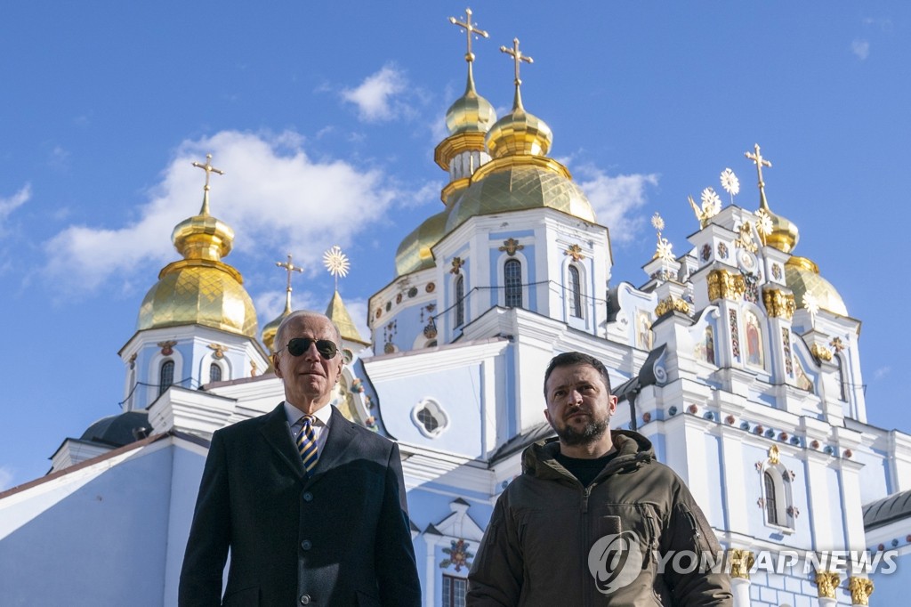 | ▲ 우크라 성미카엘 성당 주변서 나란히 걷는 바이든과 젤렌스키 (키이우 AP=연합뉴스) 조 바이든 미국 대통령(왼쪽)과 볼로디미르 젤렌스키 우크라이나 대통령이 20일(현지시간) 우크라이나 수도 키이우 시내 중심부에 있는 성미카엘 대성당 주변을 나란히 걷고 있다. 이 성당은, 건물 앞 광장에 파괴된 러시아 탱크가 전시돼 있어 키이우를 찾는 해외 고위인사들이 자주 방문한다. 2023.02.21 jason3669@yna.co.kr |
