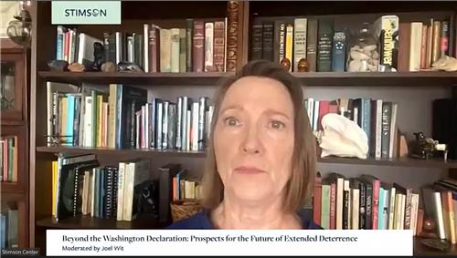 | ▲ Elaine Bunn, former deputy assistant secretary of defense for nuclear and missile defense policy, is seen speaking during a webinar hosted by the Stimson Center, a think tank based in Washington, on May 16, 2023 in this captured image. (Yonhap) |