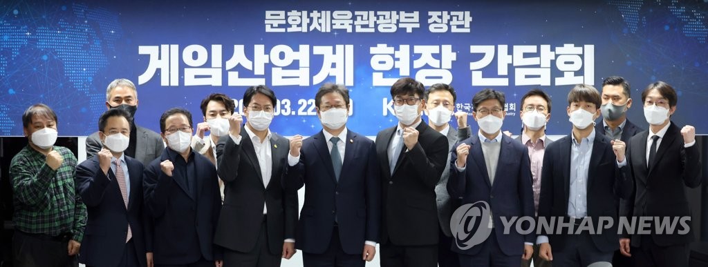 | ▲ 게임산업계 현장 간담회 참석한 황희 장관 (서울=연합뉴스) 황희 문화체육관광부 장관(앞줄 가운데)이 22일 서울 강남구 한국게임산업협회 회의실에서 게임업계 대표들과 간담회를 마치고 기념촬영을 하고 있다. 2021.3.22 [문화체육관광부 제공. 재판매 및 DB 금지] photo@yna.co.kr |