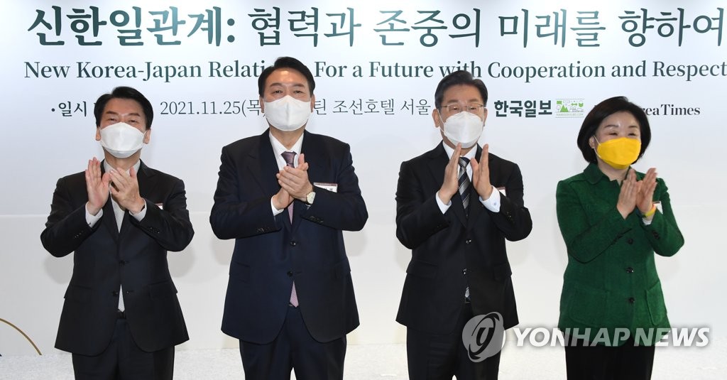 | ▲ 박수치는 대선후보들 (서울=연합뉴스) 작년 11월 서울 웨스틴조선호텔에서 열린 ‘2021 코라시아포럼(THE KOR-ASIA FORUM 2021)’행사 개막에 앞서 정의당 심상정·더불어민주당 이재명·국민의힘 윤석열·국민의당 안철수 대선후보가 박수치고 있다. 2021.11.25 [국회사진기자단] |