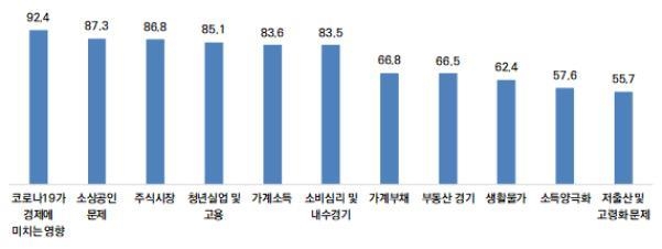 '코로나19가 경제에 미치는 영향' 92.4점, '소상공인 문제' 87.3점, '주식시장' 86.8점, '청년실업 및 고용' 85.1점, '가계소득' 83.6점, '소비심리 및 내수경기' 83.5점 등이었다.