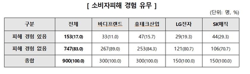 업체별 피해 경험률은 SK매직 29.3%, LG전자 19.3%, 휴테크산업 15.7%, 바디프랜드 11.0%였다.