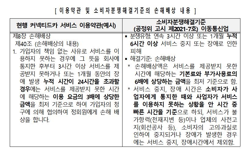 | ▲ 현행 커넥티드카 서비스 이용약관(예시)과 소비자분쟁해결 기준의 이동통신업 손해배상 내용[한국소비자원 제공, 재판매 및 DB금지] |