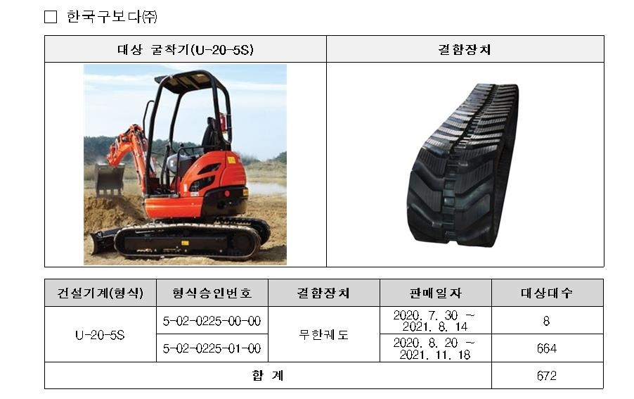 한국구보다가 수입·판매한 굴착기(U-20-5S) 672대는 무한궤도 바퀴 폭이 240㎜로, 형식승인 제원(250㎜)과 달라 리콜을 진행한다.