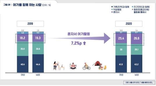 코로나19 이후 생활 변화를 보면 2020년 '혼자서 여가활동을 한다'는 응답이 여성 25.4%, 남성 26.6%로 전년보다 각각 7.2%포인트, 7.3%포인트 높아졌다. 남성은 컴퓨터 게임이나 인터넷 검색, 운동을 더 많이 했고, 여성은 종교활동을 남성보다 더 많이 했다.