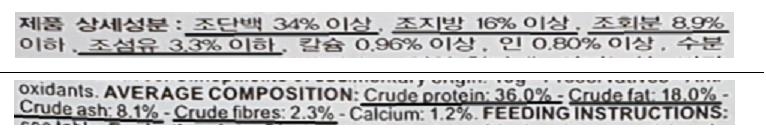예를 들어 영문 표현에는 'Crude fat(min) 17%'였지만 국문 표현에는 '조지방 13% 이상'으로, 'Protein 21.0%'는 '조단백 19% 이상'으로 표기된 사례가 있었다.