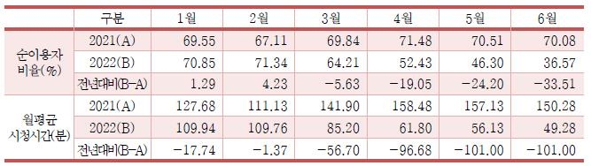 올해 들어 단계적 일상회복(위드 코로나) 여파로 외부 활동이 늘어나면서, 작년과 달리 스마트폰으로 방송프로그램을 장시간 보는 일이 줄었기 때문으로 관측된다.