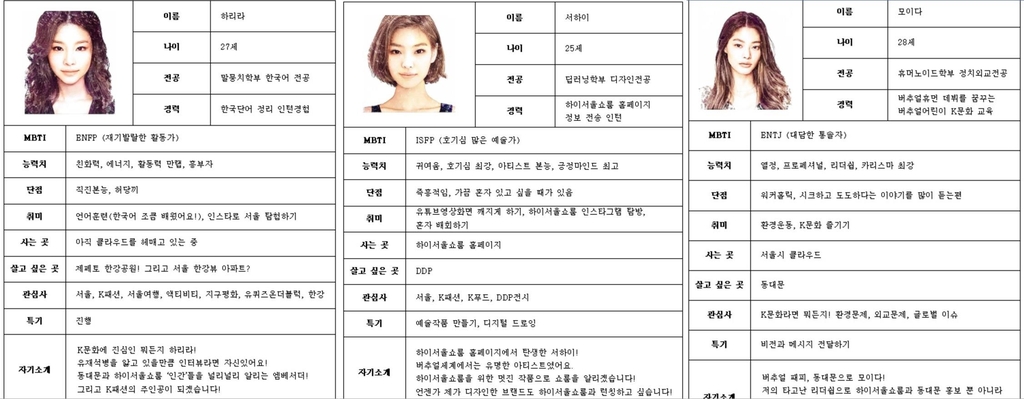가상 인턴 후보는 '서하이', '하리라', '모이다' 3명이다. 투표 사이트에는 이들의 성격, MBTI 등 정보와 명함사진이 부착된 자기소개서가 공개됐다.