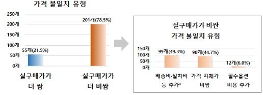 실구매가가 더 높은 이유와 원인별 비중을 보면 비교사이트에는 무료배송으로 표기돼있지만 실제로는 배송비나 설치비가 추가되는 사례가 49.3%였고 상품 가격 자체가 더 비싼 경우도 44.7%였다.