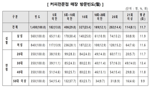 커피전문점 방문 빈도는 한 달 평균 11.7회로 조사됐다. 개인별로 월 '5∼10회 미만'이 29.0%로 가장 많았고, '10회'가 23.4%였다.