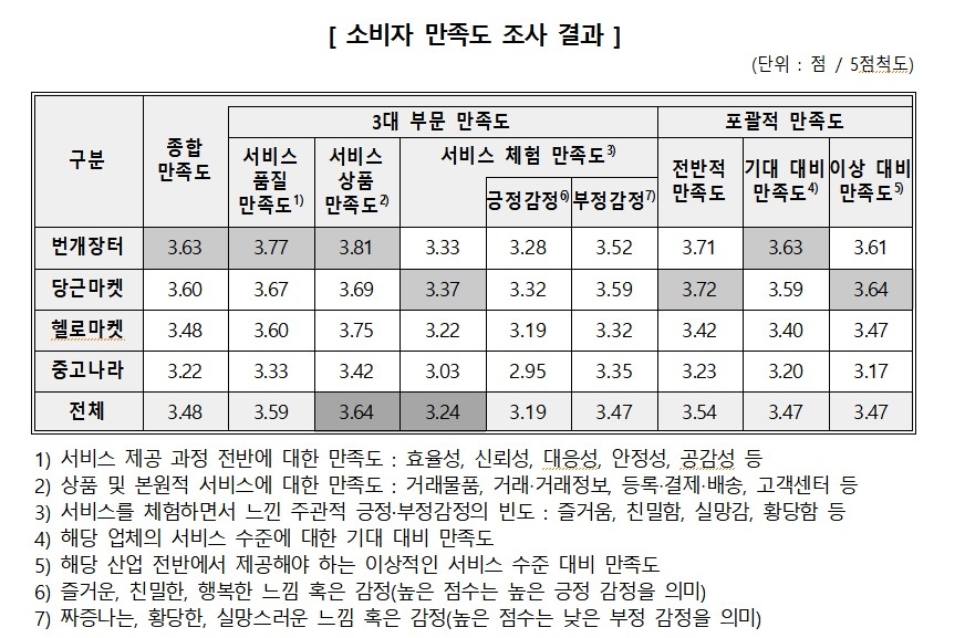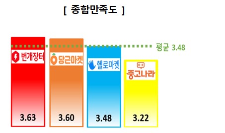 사업자별 만족도는 번개장터가 3.63점으로 가장 높았고 이어 당근마켓(3.60점), 헬로마켓(3.48점), 중고나라(3.22점) 순이었다. 번개장터와 당근마켓 간 종합만족도 차이는 오차 범위 내였다.