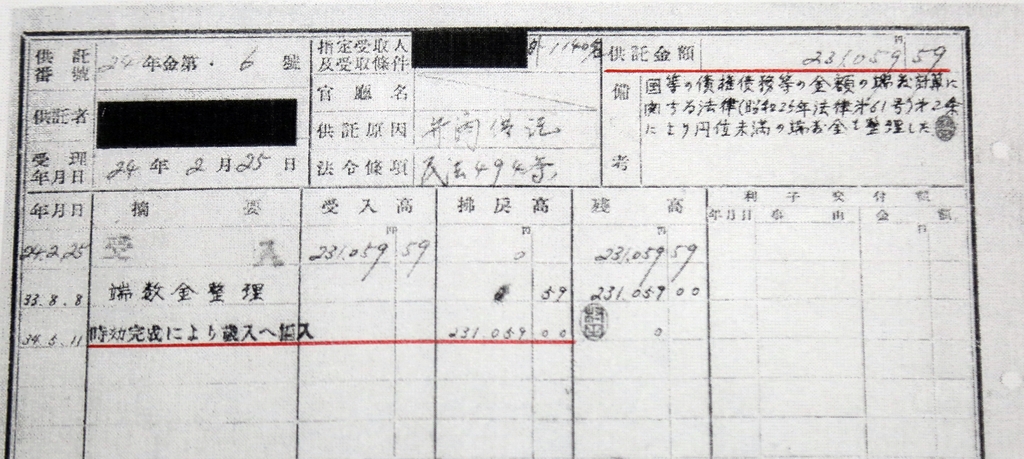 일본 당국은 공탁금의 시효가 완성된 것으로 간주해 1959년 5월 11일 공탁금을 국고에 편입한 것으로 기재돼 있다.