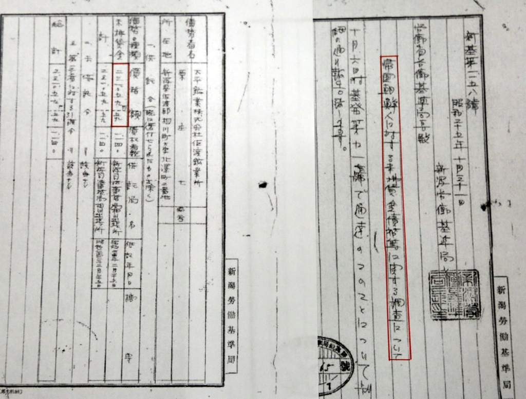 일본 니가타(新潟)노동기준국이 작성한 공문서인 '귀국 조선인에 대한 미불임금채무 등에 관한 조사에 관해'를 연합뉴스가 확인해보니 1949년 2월 25일에 1천140명에 대한 미지급 임금으로 23만1천59엔59전이 공탁된 것으로 기록돼 있었다.