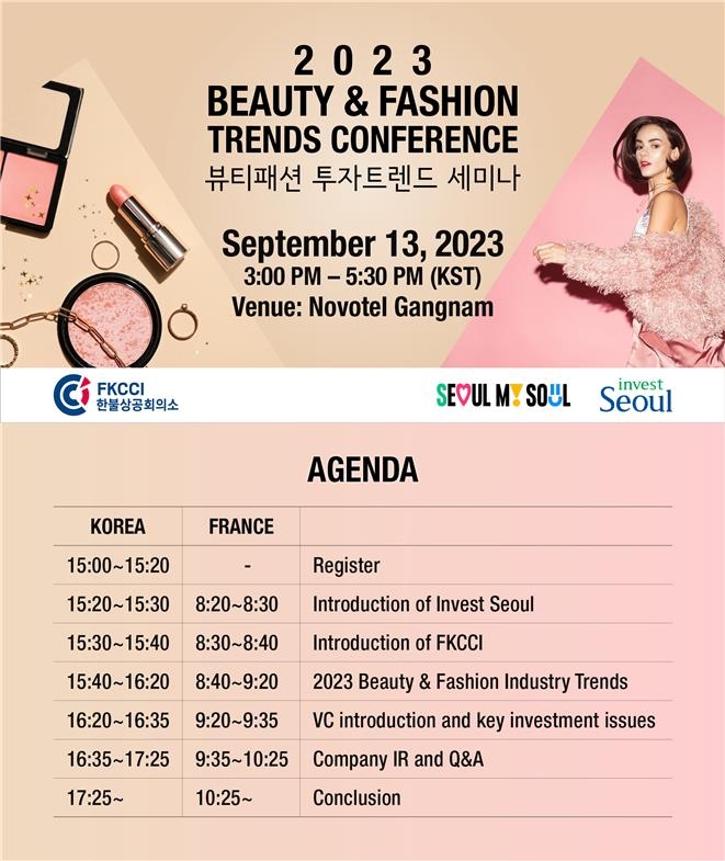 세미나는 한국과 프랑스에서 온라인으로 동시에 송출되며 '2023 뷰티패션 트렌드' 발표, 올해의 투자 전망 소개, 유망 국내기업 투자유치(IR) 등이 예정돼 있다.