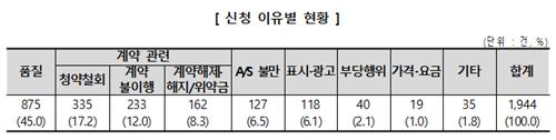 이어 청약철회 등 계약 관련 730건(37.5%), 애프터서비스(A/S) 불만 127건(6.5%), 표시·광고 118건(6.1%) 순이었다.