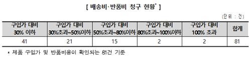 제품 구매가격과 반품비용이 확인되는 81건을 분석한 결과 배송·반품비로 구매가의 절반 이상을 청구한 경우는 19건(23.5%)이었다.
