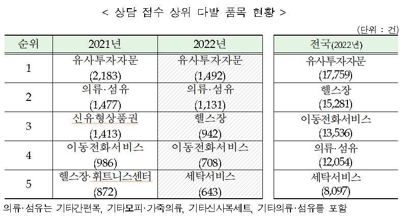 품목 분야별로는 유사투자자문(1천492건), 의류·섬유(1천131건), 헬스장(942건), 이동전화서비스(708건), 세탁서비스(643건) 순으로 상담이 많았다.