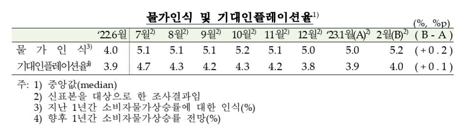 황희진 한은 통계조사팀장은 "소비자물가 상승률이 1월 다시 5.2%로 높아진데다, 공공요금 인상 예고가 이어지면서 '물가가 쉽게 낮아지지 않겠다'는 예상이 늘어난 것 같다"고 설명했다.