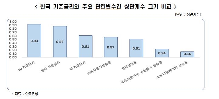그 결과 한국의 기준금리가 가장 밀접한 상관관계를 갖는 변수는 유럽연합(EU)의 기준금리였고, 영국 기준금리, 미국 기준금리, 소비자물가상승률, 경제성장률이 뒤를 이었다.