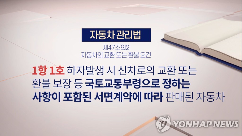 (서울=연합뉴스) 최평천 기자 = 새로 산 자동차가 계속 고장 나면 제조사가 교환·환불을 하도록 한 이른바 '한국형 레몬법'(자동차관리법 제47조 2항)이 실질적인 소비자 권익 보호를 위해 개선된다.