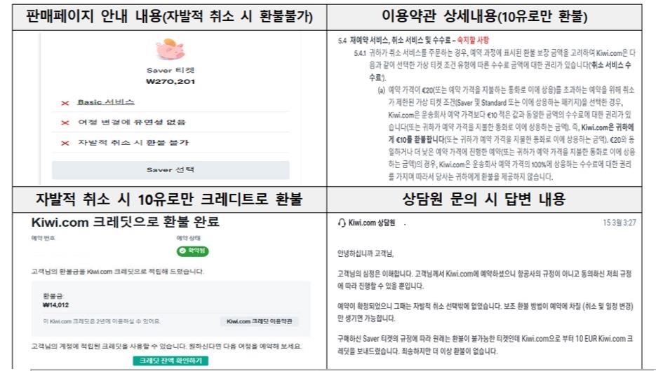 키위닷컴은 판매 페이지에 '자발적 취소 시 환불 불가' 조건을 표기하고 이용 약관에는 10유로만 적립금으로 지급한다고 고지하고 있다.