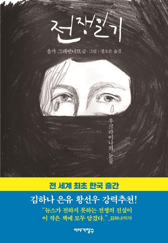 (서울=연합뉴스) 이은정 기자 = 온통 검은 바탕 안에 슬픈 표정의 눈이 담겨있다. 두 눈에선 굵은 눈물방울이 떨어진다. 우크라이나 그림책 작가 올가 그레벤니크(36)가 몸소 겪은 전쟁의 참상을 기록한 책 '전쟁일기'(이야기장수)의 표지다.
