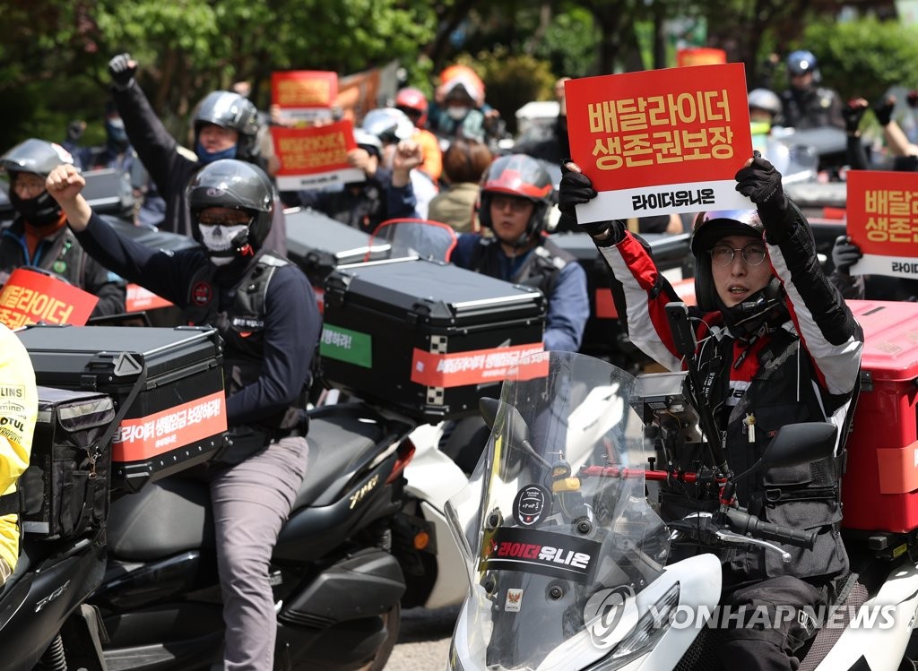 | ▲ '배달라이더 생존권 보장' (서울=연합뉴스) 김성민 기자 = 10일 오후 여의도 산업은행 인근에서 민주노총 공공운수노조 라이더유니온 관계자들이 처우 개선을 요구하며 구호를 외치고 있다. 2023.5.10 ksm7976@yna.co.kr |